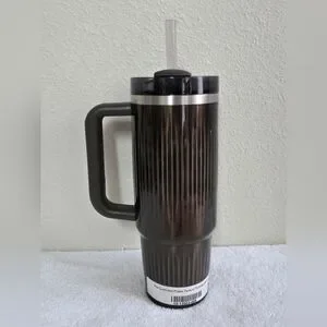 Stanley insulated travel mug with secure screw-on lid. Ribbed exterior for better grip. Removable straw for easy sipping. Durable stainless accent near lid. Great for daily beverages.
