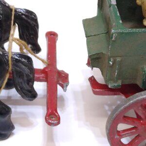 This vintage cast iron toy features a horse-drawn wagon with a driver and distinct red wheels. A charming collectible for antique enthusiasts.