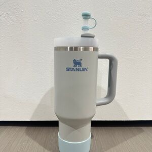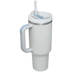 Stylish Stanley tumbler with handle. Keeps drinks hot or cold. Perfect for travel.