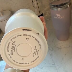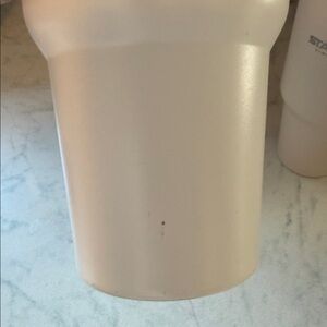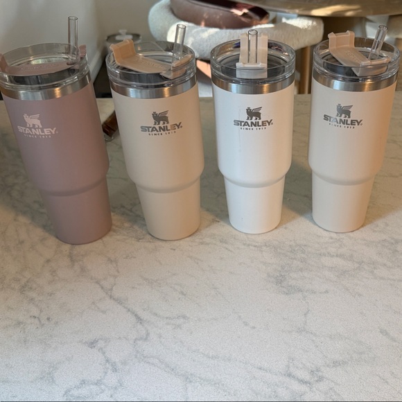Four Stanley tumblers in earthy shades. Ideal for any beverage. Sleek and robust design. White has a few flaws as pictured, other 3 are perfect