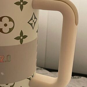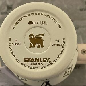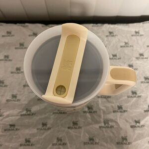 Stylish Stanley tumbler with a cream handle and black accents. Ideal for maintaining beverage temperature.