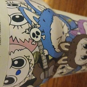 Insulated Stanley tumbler featuring a whimsical labubu character artwork. Design includes cute expressive eyes and playful details in blue and pink accents.