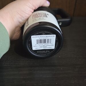 Stylish Stanley travel mug. Features a bold black and white look. Comfortable handle for easy carrying.