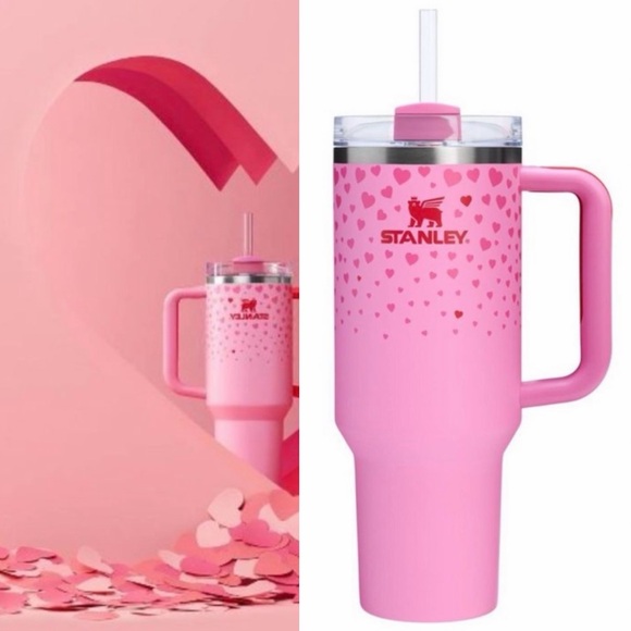 Sip in style with this Stanley tumbler. Features a pink hue with charming heart designs. Perfect for any beverage.