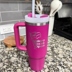 Bold magenta Stanley travel mug. Features a convenient handle and straw. Ideal for beverages on the go.