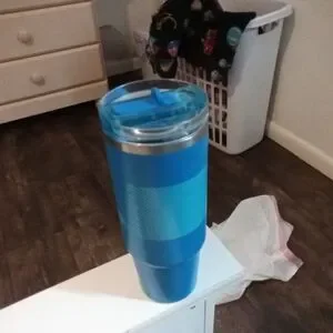 Robust travel mug with a secure lid. Comfortable handle for easy carrying. Keeps drinks hot or cold. a couple of scratches but needs to be washed due to dust