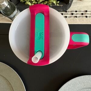 Bold pink tumbler by Stanley. Keeps drinks hot or cold. Durable and stylish.