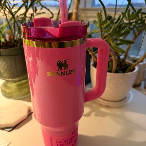Bright pink Stanley tumbler with a sturdy handle and straw. Features a shiny gold band.