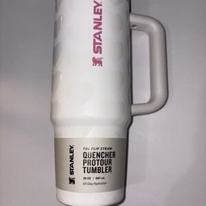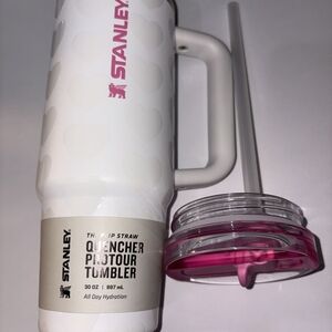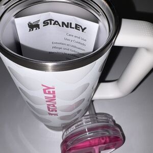 White tumbler with heart pattern. Features Stanley logo in pink.
