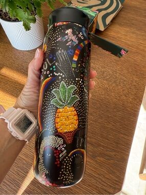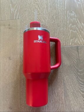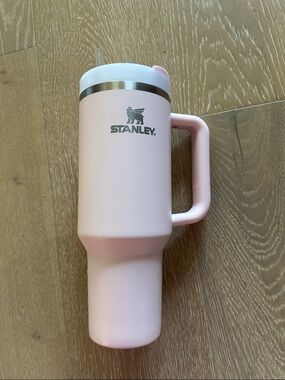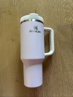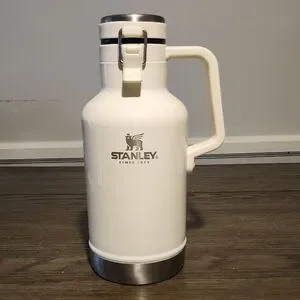 Heavy-duty insulated growler for hot or cold drinks. Secure latch and sturdy handle for easy carrying. Stainless-steel base and leak-resistant cap. Clean white finish with Stanley logo.