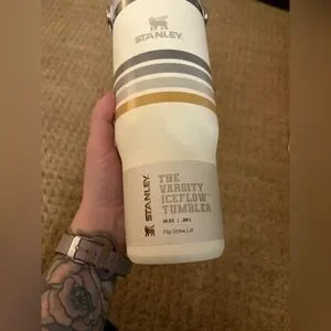 Stanley White Tumbler with Gray and Gold Stripe Accents