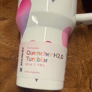 Stylish Stanley tumbler with vibrant pink hearts. Ideal for keeping drinks hot or cold.