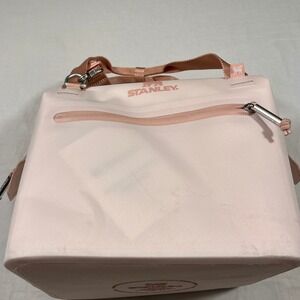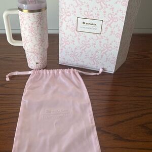 Elegant Stanley tumbler with pink bow pattern. Includes matching pink drawstring bag.