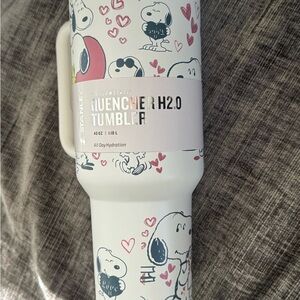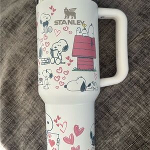 Stanley tumbler featuring Snoopy design. White base with pink accents. Ideal for hydration.
