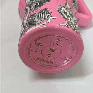 Vibrant pink Stanley water bottle featuring green and white Wicked 2 artistic designs. Designs have a slightly raised texture. Gold metal accents. Pink lid and straw. Like new