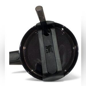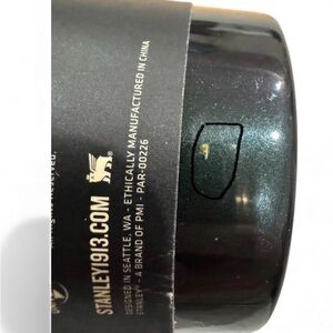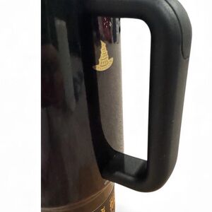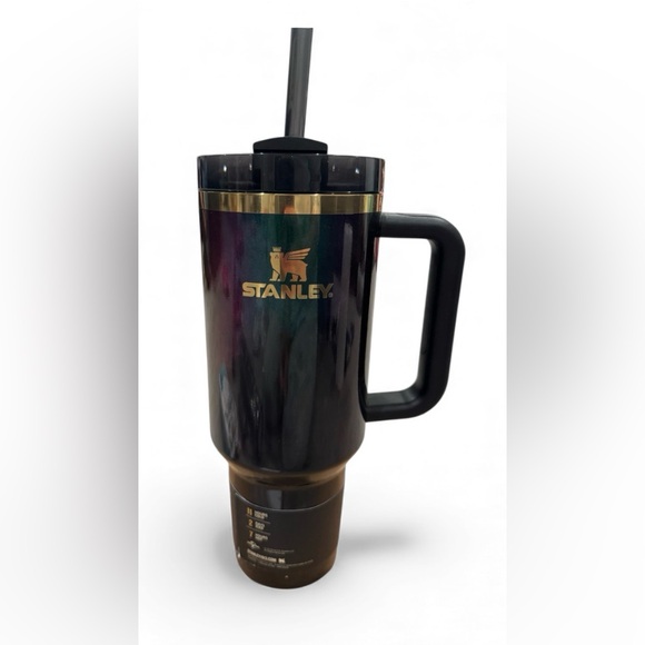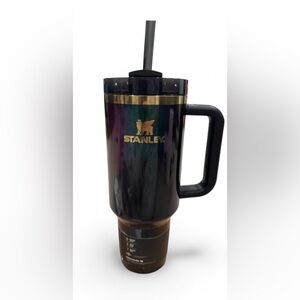 Elegant Stanley mug with sleek black design and gold trim. Ideal for travel.