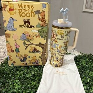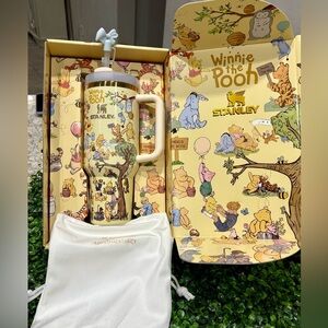 Charming Stanley tumbler featuring Winnie the Pooh illustrations. Includes a handle and straw lid.