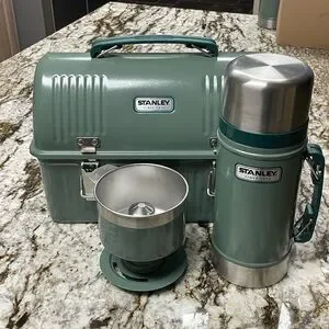 Durable Stanley stainless steel lunchbox, thermos with latch closure and coffee brew-over. Coffee mug not included. Excellent preowned condition