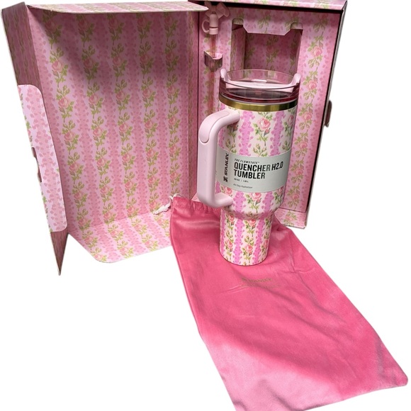 Charming Stanley tumbler with floral design. Features a convenient handle. Ideal for daily hydration.