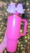 Stylish Stanley tumbler in pink. Features a glittery bow on top. Perfect for on-the-go hydration.