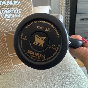 Stanley Flowstate Tumbler in sleek black and silver. Comes with a convenient handle for easy carrying and comes with reusable straw.