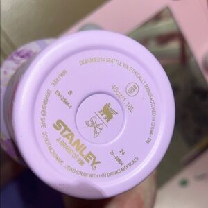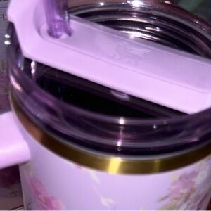 Elegant Stanley tumbler with floral pattern. Features pink and gold tones.