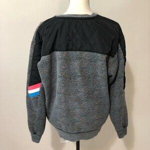 Gray with colors woven in the fabric. Has zipper pockets on the front. Black quilted accents on back and arms. Excellent gently worn condition with very minimal signs of wear on the arm see last photo. Measurements in listing photos.