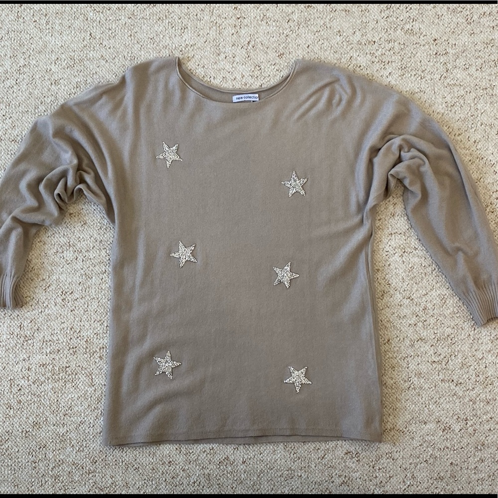 Silver rhinestone star beige top.