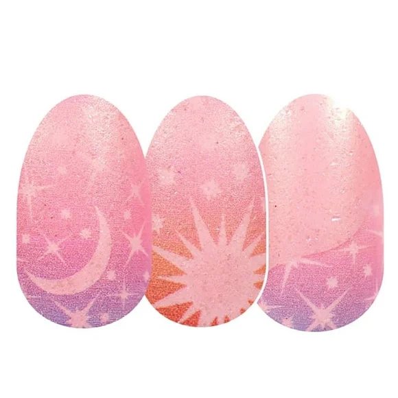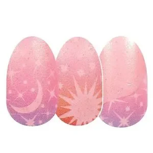 Star-Crossed, an out of this world design of the sun, moon, and stars in pink, orange, and blue! Shimmer finish.