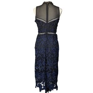 Star Crossed Lovers Midi Dress Size M Black and Blue Lace Mock Neck Chic Evening