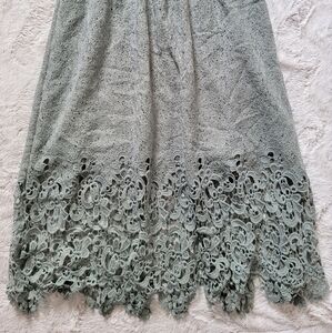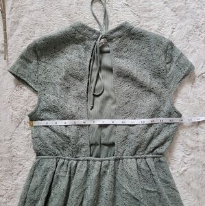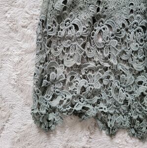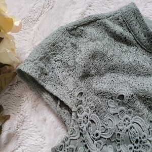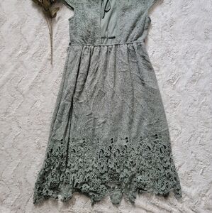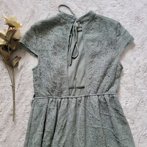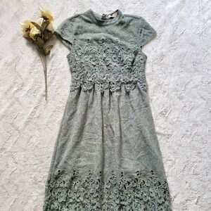 Keywords: Lacey dress, fit and flare, cap sleeve, high collar, mock neck, crochet detail, A-line silhouette, romantic, Sage green, seafoam green, dusty green, Cottagecore, coquette, bohemian, vintage-inspired, rustic, earthy tones, Victorian