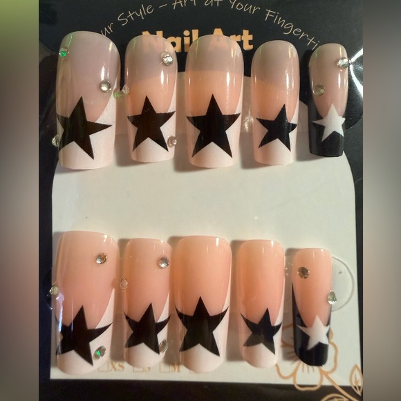 Stylish false nails featuring black star designs and rhinestone accents. Perfect for a bold look.