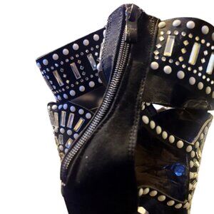 The Star Diamond Black Sandal Pumps feature a dazzling display of baguette-shaped faux diamonds and flat beads, bursting elegantly at the center of your ankles. The thin straps at the toes and feet are adorned with flat beads, adding a touch of glamour and sophistication to your look.
