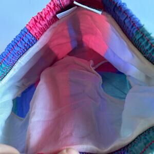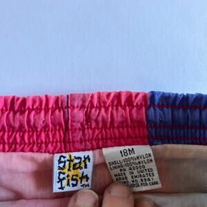 Star Fish Vintage Boys Sz 18 Months Red, Blue & Green Striped Swim Trunks Retro. The shell and lining are 100% nylon. The waist measures 19 inches and the inseam is about 1.5 inches. Slight fading and pilling.