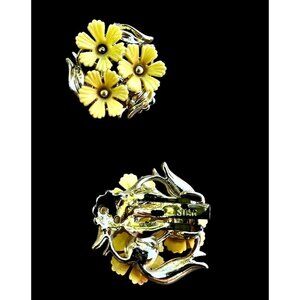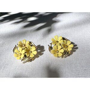 Star Floral Yellow Flowers Clip-On Earrings Vintage Silver Tone Leaves MCM