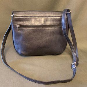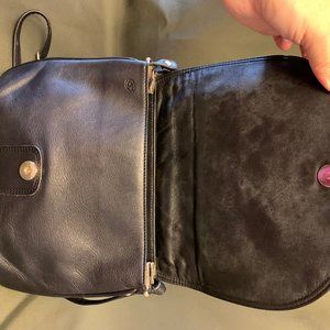 Pre-owned, very gently used Star International black leather crossbody bag. Purchased in Germany years ago. Main body of bag consists of two sections and a zippered pocket. Also contains zipper pocket on the back of the bag. Slight scuffs on front of bag from use but otherwise in very good condition overall.
