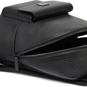 Tonal hardware keeps the details to a minimum on a pebbled-leather backpack with plenty of pockets to keep you organized.