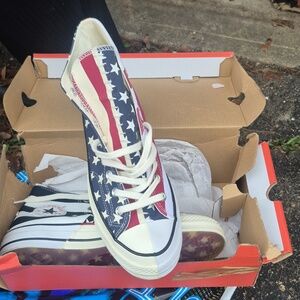 Stylish high-top sneakers with a star pattern. Features a blue and white design with red accents.
