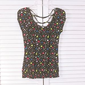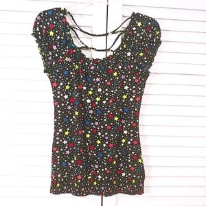 Super cool light weight shirt with different color stars, cute cross string back, short ruffled cap sleeves & fitted stretch waist at the bottom. Great condition, no flaws 🌺 Bundle for discounts 💕