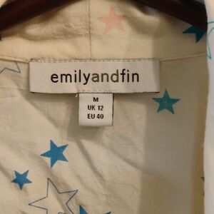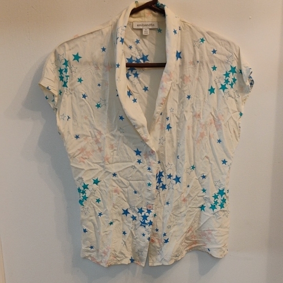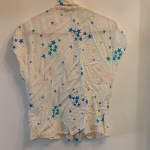 Chic blouse with blue and teal star patterns. Perfect for casual outings, 4th of July, and any hot summer day or night. the fabric feels like silk though I can't be sure cuz there's no label.