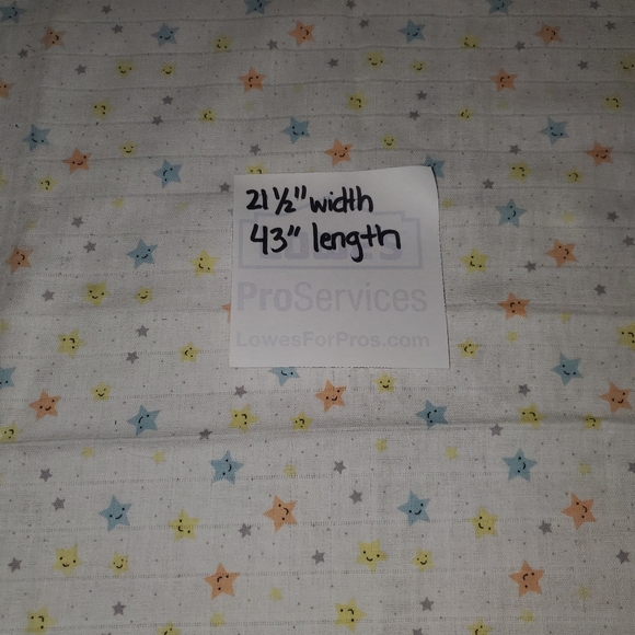 Cotton fabric. White background with blue, yellow, and orange stars. Measurements are approximate.