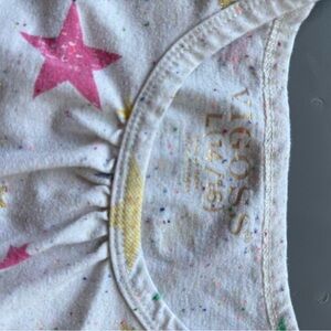 Charming t-shirt with colorful star patterns. Features pink, yellow, green, and blue stars on a cream background. Perfect for casual wear.