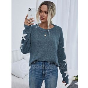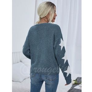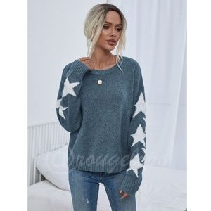 Star Print Knit Sweater Pullover Long Sleeve White on Blue