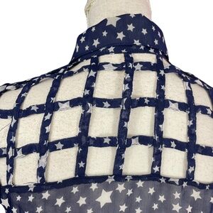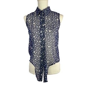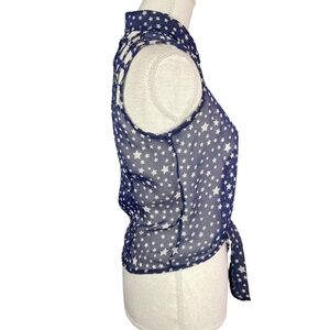 Star Print Lattice Sleeveless Blouse M Tie Waist Collared Caged Navy Blue Top