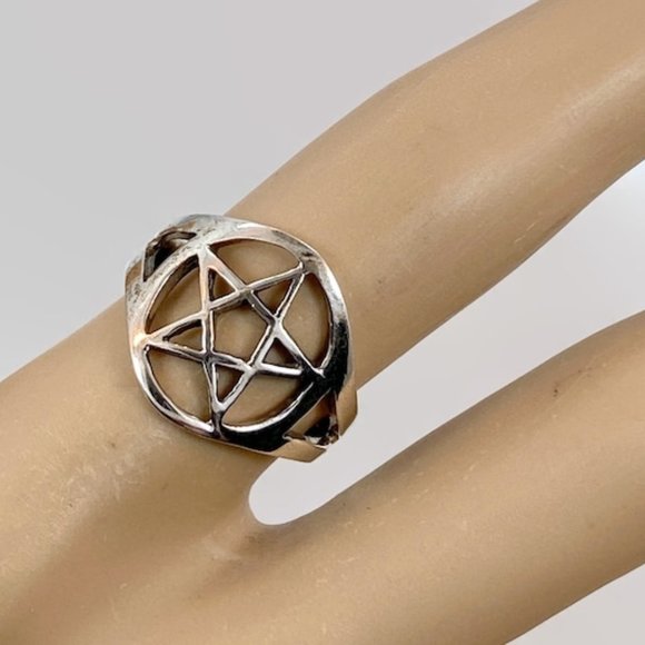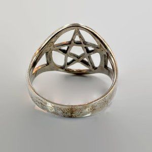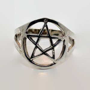 This is a vintage sterling silver ring. It features an open star of sterling that is inside a circle. This is unisex piece that can be worn by a man or a woman.