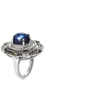 This stunning and unique ring was created by an Italian jewelry design family. A blue star sapphire is surrounded by a halo of multi-gemstones set in a beautiful star and moon motif that captures the magic of the night sky. The other gems are: Ethiopian Opals, Yellow and Blue sapphires, and Colorless and Brown Zircon. The stones are set with either a prong or bezel.