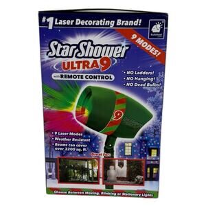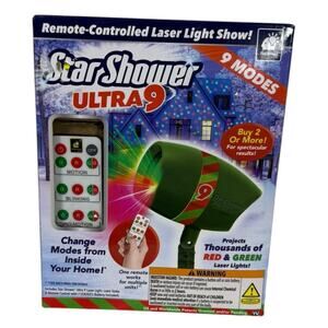 Get ready to light up your home with this Star Shower Ultra 9 laser light show! It projects beautiful green and red lights and comes with a remote control for easy operation. Perfect for holidays, parties, or just adding some fun to your everyday life.
