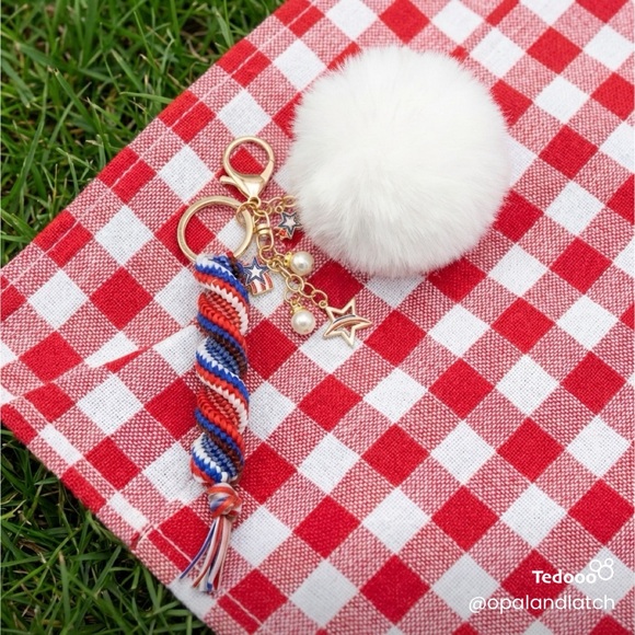 Handcrafted with a bold red, white, and blue twisted cord design, this keychain is paired with a soft white pom pom, gold hardware, and delicate star charms for the perfect mix of cute and classy. The luminiscent details glow in the dark, making it easy to find your keys while adding a fun, eye-catching touch.