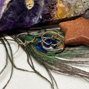 Star Stacking Ring Set (6 pcs) in great condition. Set features three silver, two gold, and one rose gold toned ring. Sizes range from approx. 6.5-7.5. Shows signs of wear.