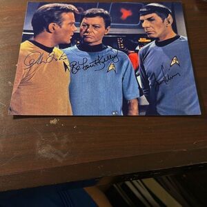 Keywords: original photograph, signed photo, William Shatner, Leonard Nimoy, DeForest Kelley, Star Trek memorabilia, collectible, sci-fi, fan convention, home office decor, autographed, pre-owned, television history, iconic trio, memorabilia collection, conversation starter.